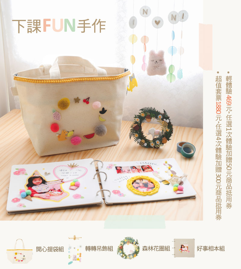下課了放下孩子的書包,邀請您與孩子來FUN手作,探索雙手的無限可能,共創暖心回憶。