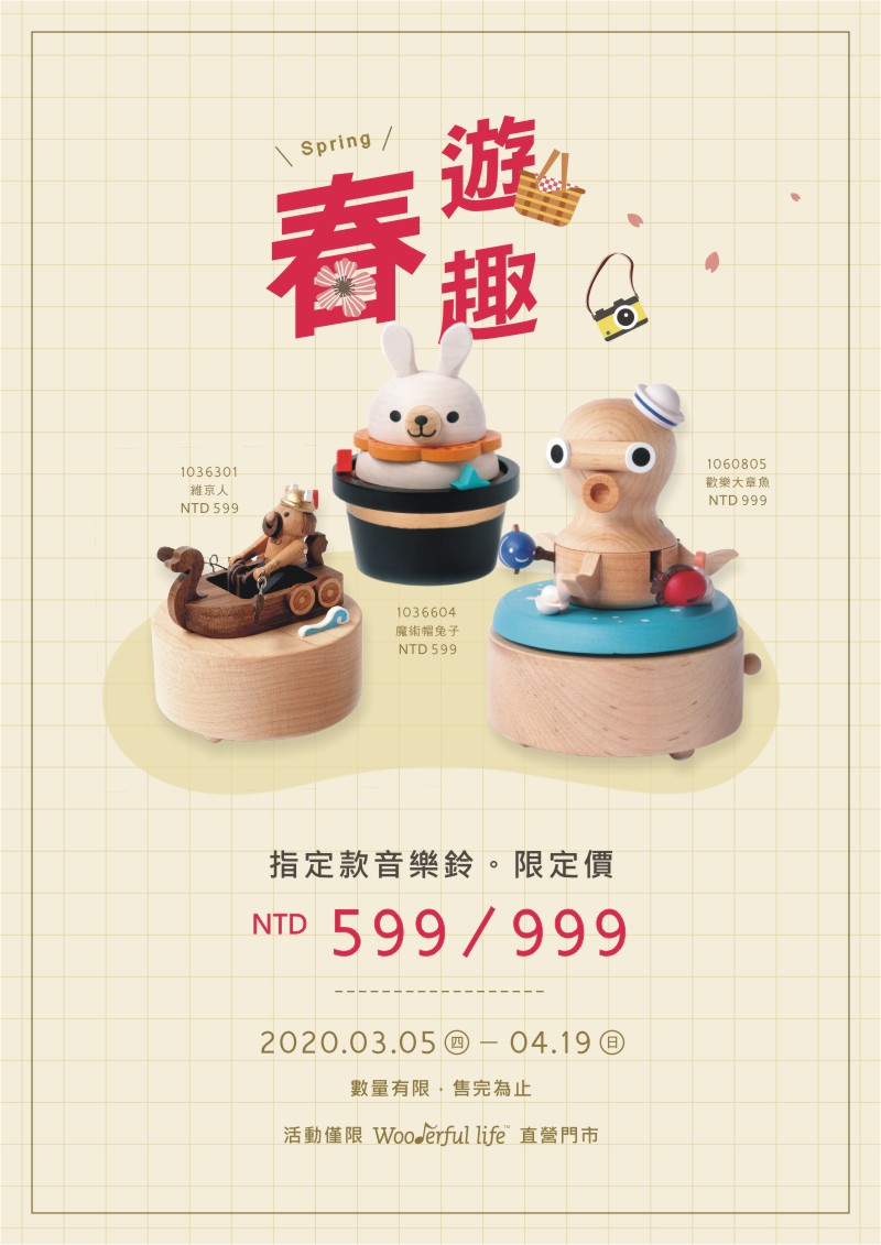 ✨ 活動方式:凡活動期間於 Wooderful life 直營門市購買指定款式音樂鈴,即可享 599/999 春遊趣限定優惠價,數量有限,售完為止!