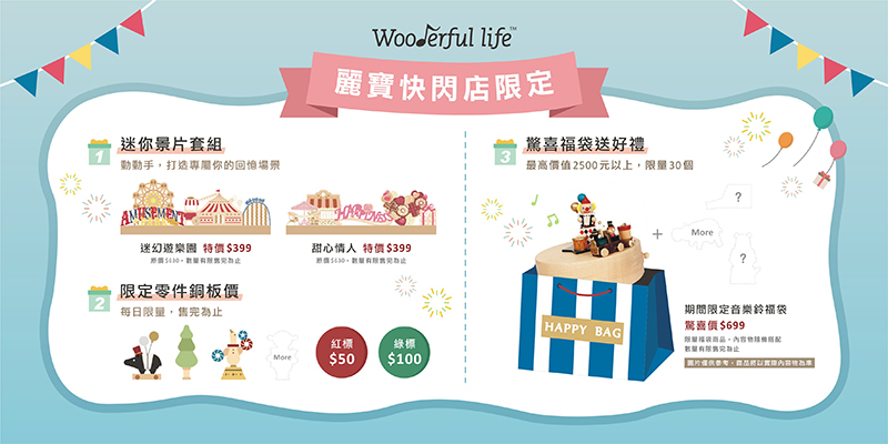 活動期間至 Wooderful life 臺中麗寶快閃店,購買指定迷你景片套組 : 優惠價 399 元!(原價 630 元, 數量有限售完為止。)