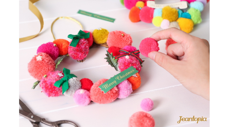 一顆顆的絨球沾上膠,隨心妝點於藤圈上,加上蝴蝶結、聖誕字牌,輕鬆完成愛的花圈。繽紛色彩更顯聖誕的趣味喜氣,柔軟觸感讓人愛不釋手,一份禮物不僅暖手也暖心。